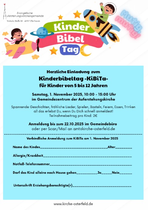 Am 1. November 2025 können Kinder am Kinderbibeltag von 10.00 – 15.00 Uhr teilnehmen – Anmeldung erbeten Flyer als PDF.
